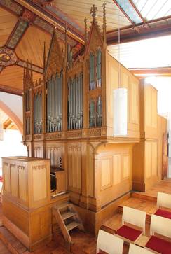 ist eine rein mechanische Kegelladenorgel mit zwei Manualen, mit neugotischem Prospekt und einer ausgeprägt romantischen Disposition. Alle Spielvorgänge werden über mechanische Verbindungen wie Seile und Stäbe (Abstrakte) gesteuert.